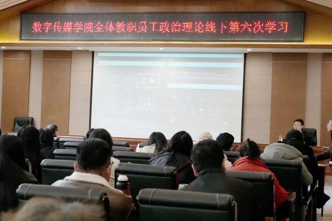 为深入学习贯彻习近平总书记关于发展新质生产力、全面依法治国等重要论述精神,落实党中央关于教育、科技、人才一体发展的战略部署,2025年11月24日,数字传媒学院在梓潼校区文昌学宫组织召开本学期第六次教职工政治理论学习会议。学院党总支书记管琳宇、副院长陈继光、各专业负责人参加学习,梓潼校区党工委书记梁宝堂列席会议。会议由数字传媒学院党总支专职组织员杨琳主持并领学。