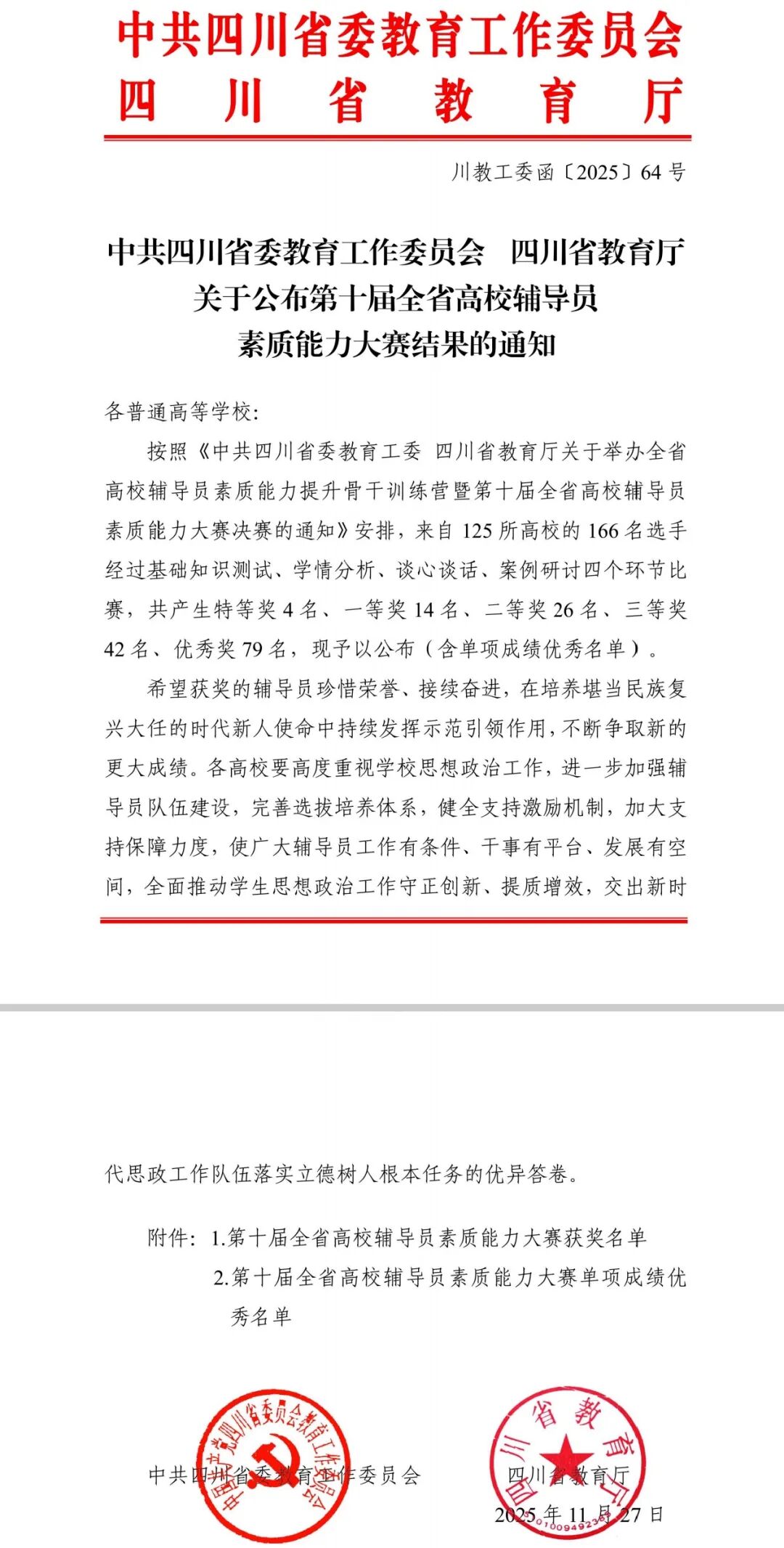 此次参赛获奖,是对王娜老师综合能力的又一肯定。此前,她已在“首届辅导员主题班会提升大赛”中获校级二等奖,还积极参与四川省“微光青语”名辅导员工作室研修、高校师德师风建设等多类培训,持续提升专业素养。在科研与教学领域,她亦成果丰硕:独立发表4篇学术论文,涵盖思政教育、学生管理等方向,参与多项省校级科研项目,将实践经验转化为理论成果,反哺育人工作。