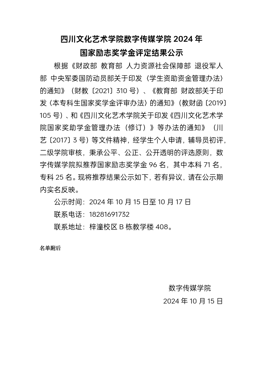 四川文化艺术学院数字传媒学院2024年国家励志奖学金评定结果公示