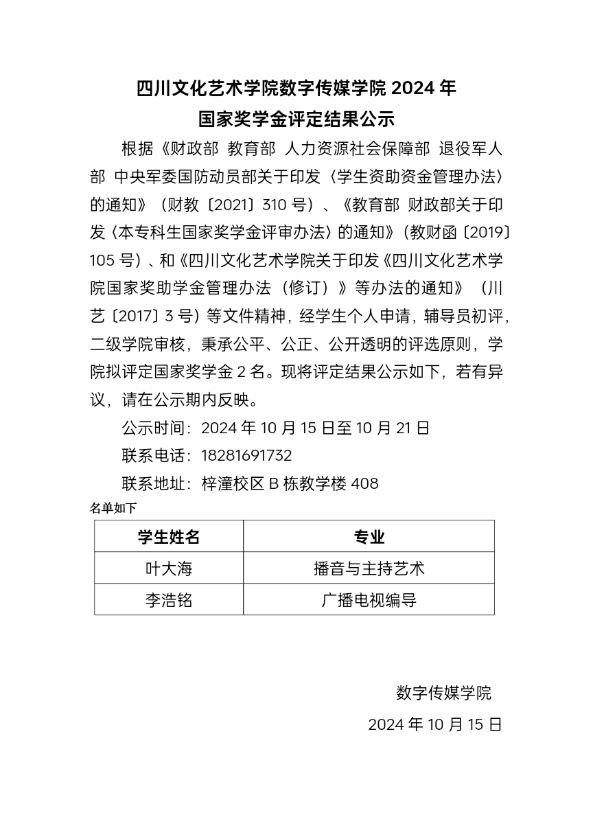 四川文化艺术学院数字传媒学院2024年国家奖学金评定结果公示