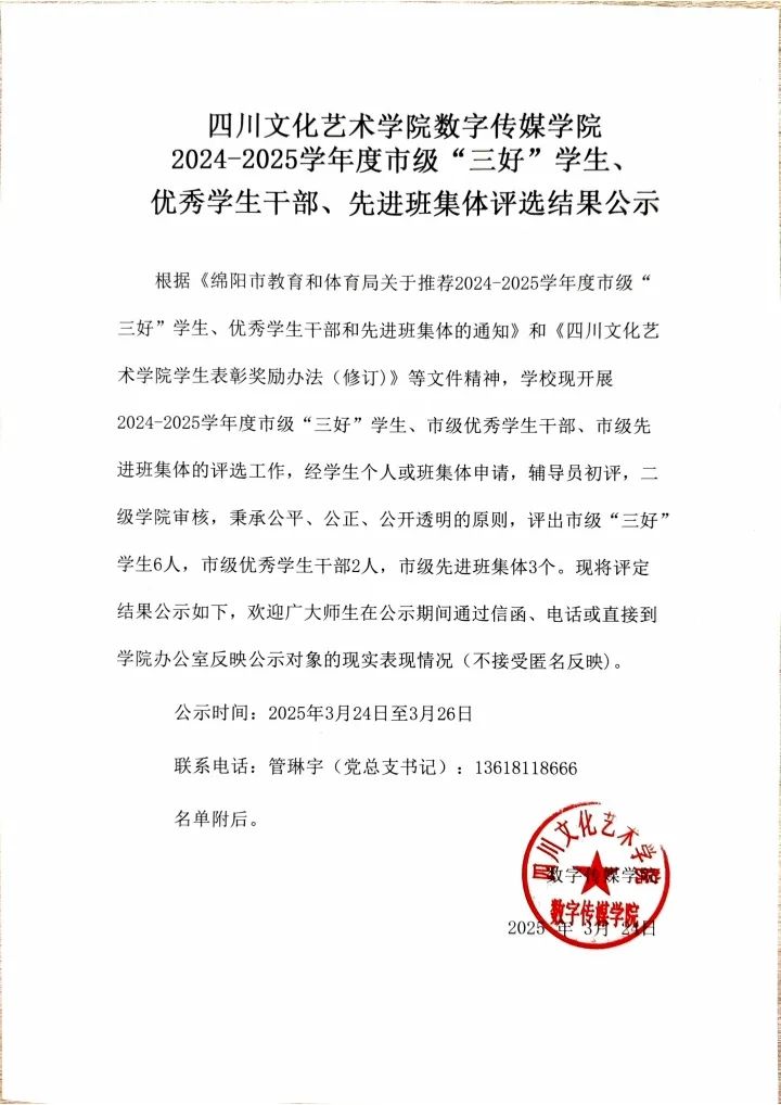 四川文化艺术学院数字传媒学院2024-2025学年度市级“三好”学生、优秀学生干部、先进班集体评选结果公示