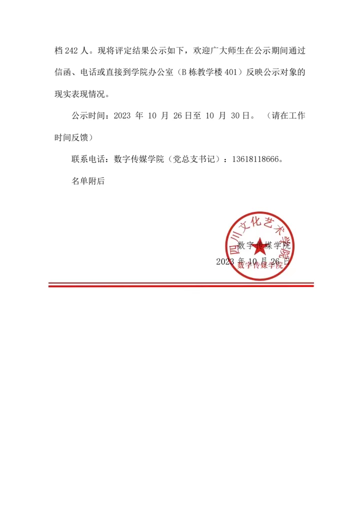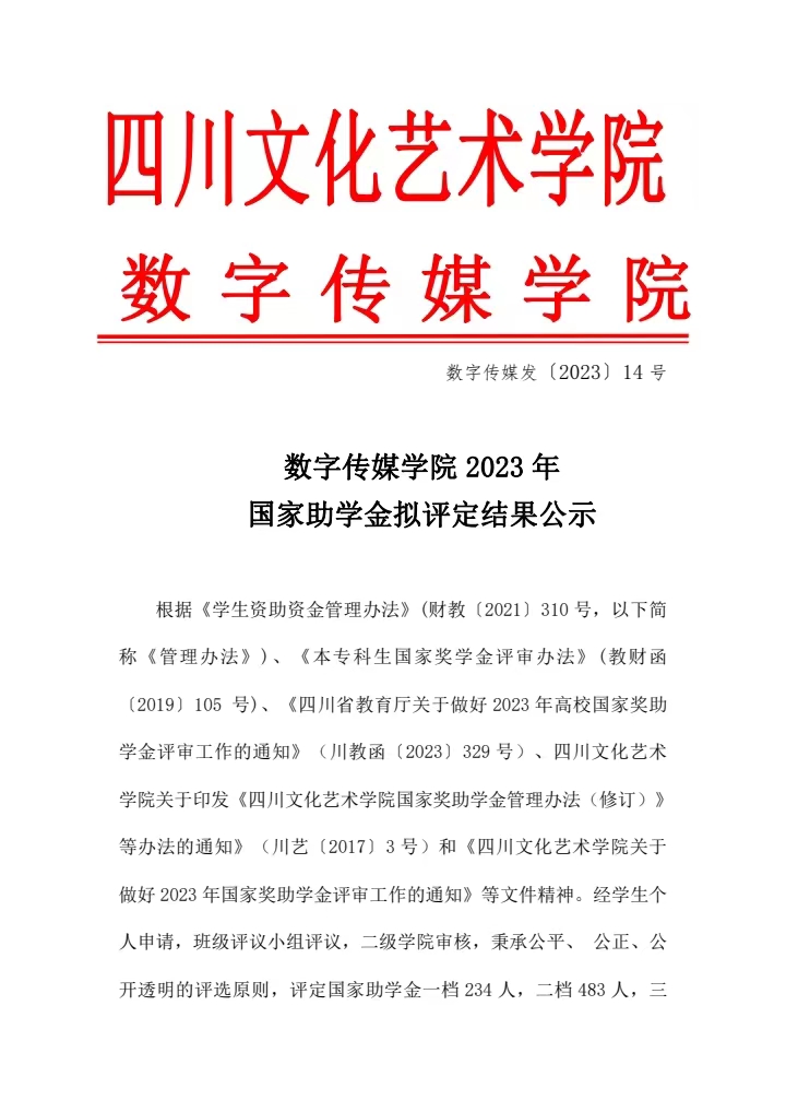 数字传媒学院2023年国家助学金拟评定结果公示