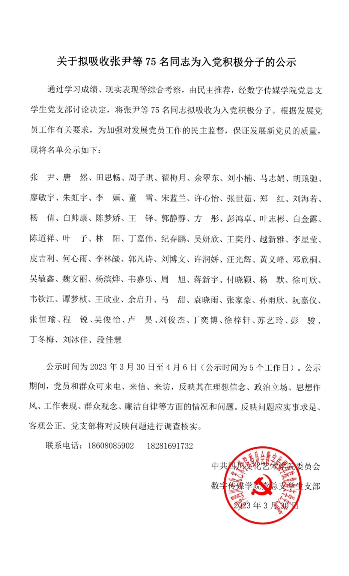 关于拟吸收张尹等75名同志为入党积极分子的公示
