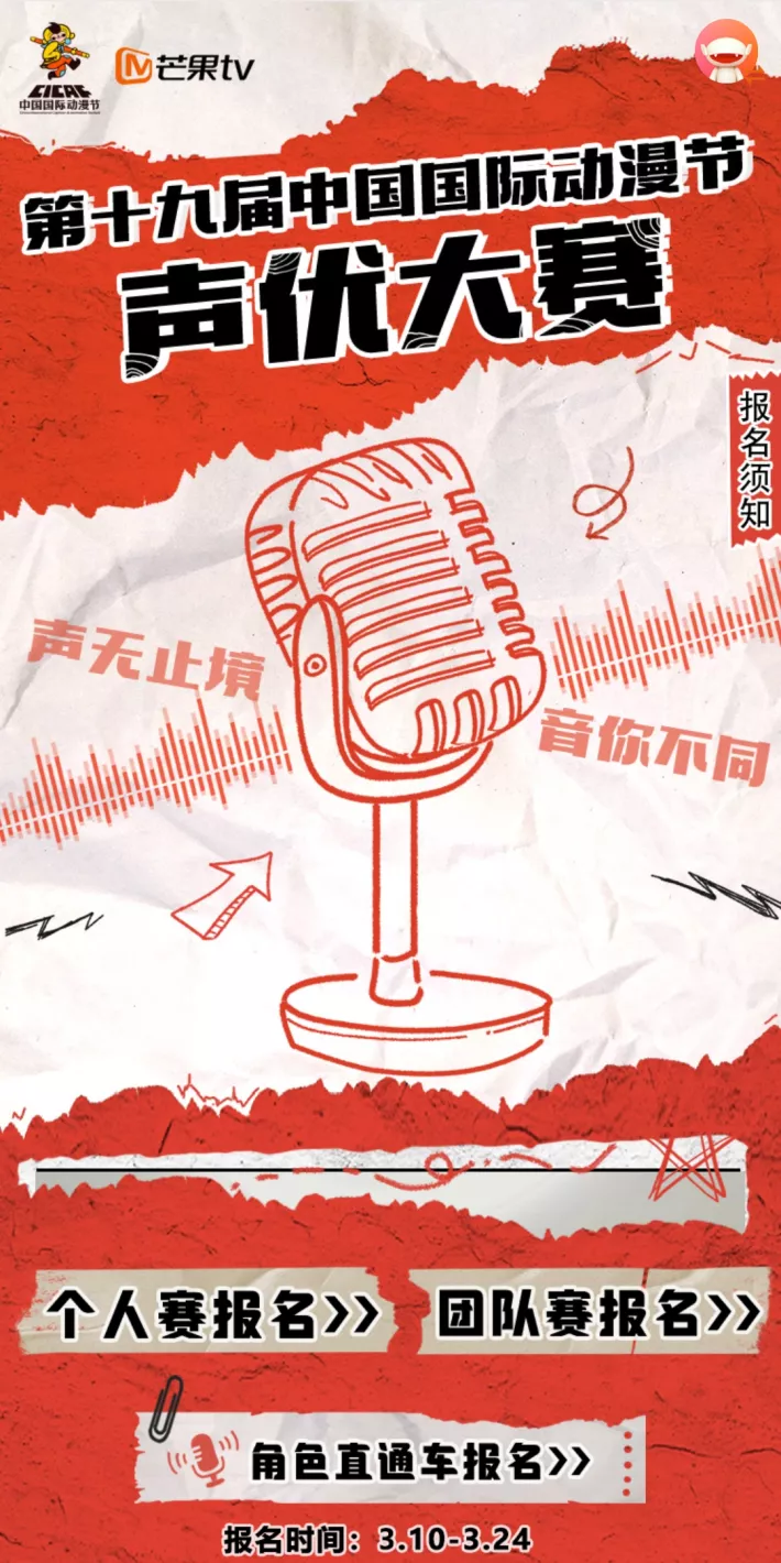 第十九届中国国际动漫节声优大赛在保留个人赛和团队赛两个赛道的同时,额外增加了一个新的赛道,那就是“角色直通车”赛道,小伙伴们报名时,三个赛道是互不影响、可以同时报名的,但是只能选择一个赛区进行报名!