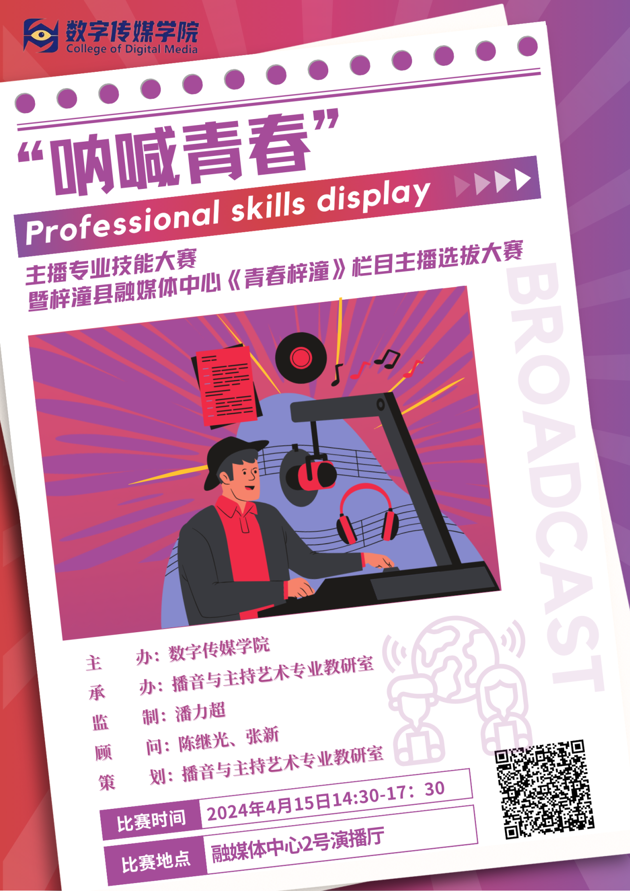 承办单位:播音与主持艺术专业教研室监 制:潘力超顾 问:陈继光、张新策 划:播音与主持艺术专业教研室比赛时间:2024年4月15日14:30-17:30比赛地点:融媒体中心2号演播厅