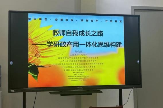 除了讲座活动,易晓蜜教授还与数字传媒学院副院长陈继光教授一起与艺术与科技全体教师进行了深入的讨论。易晓蜜教授以《教师自我成长之路——学研政产用一体化思维构建》为主题,与大家就高校一流课程建设、学科建设以及教师自我成长等议题展开了热烈的讨论和交流。她分享了自己在学术研究、教学成果和项目实践等方面的丰富经验,为教师们提供了一个相互学习、共同成长的平台。