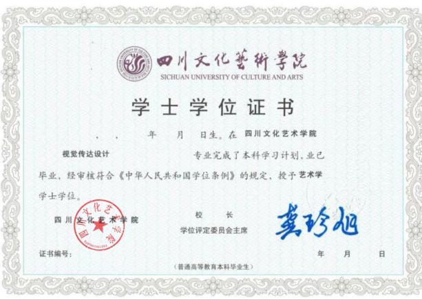 学生按要求修满中意两校规定的学分可获得四川文化艺术学院颁发的本科毕业证书、学士学位证书,最后一年赴外学习者可获得意大利里米尼自由美术学院(LABA Rimini)颁发的视觉传达设计专业学士学位证书(Diploma Accademico di PrimoLivello in Grafic Design )。